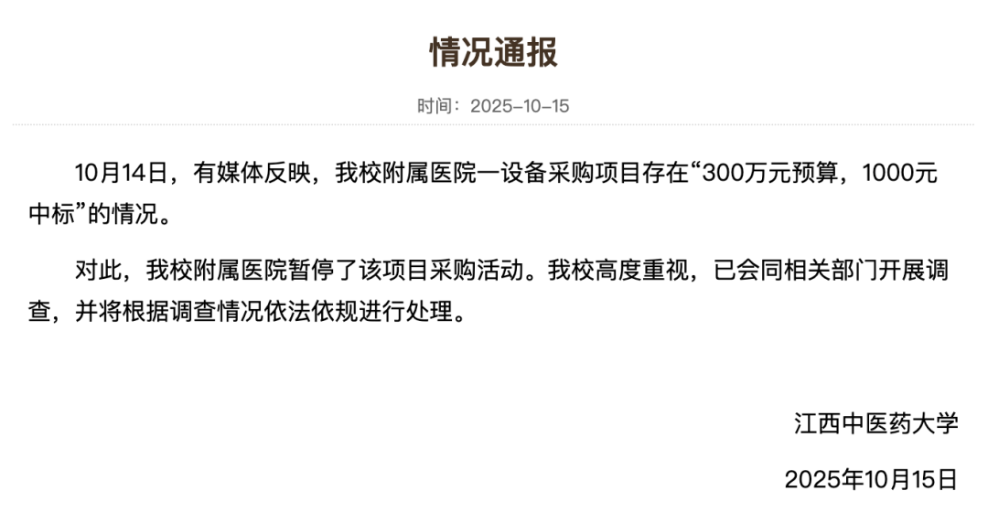10月15日,江西中医药大学发布情况通报称,10月14日,有媒体反映,该校附属医院一设备采购项目存在“300万元预算,1000元中标”的情况。