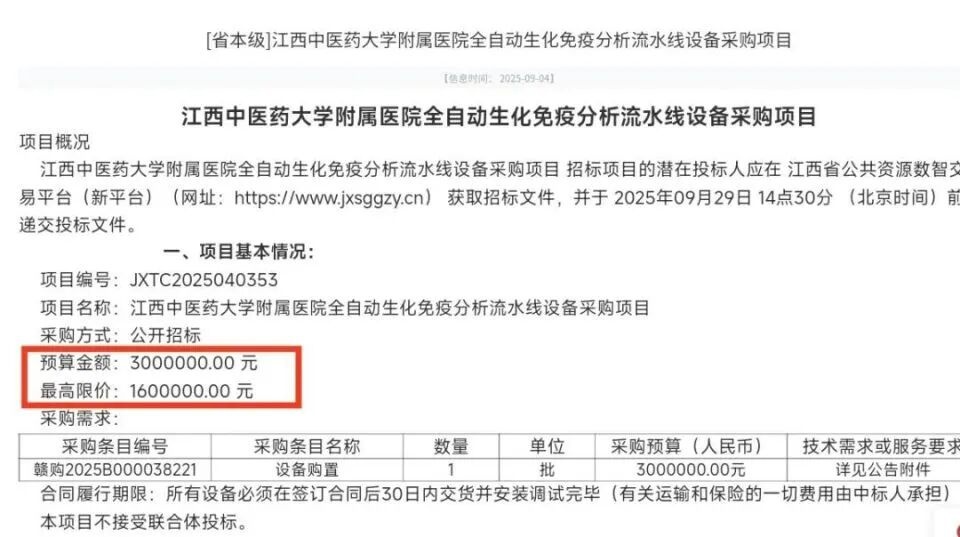 10月14日,大皖新闻记者从江西省公共资源交易平台看到,10月9日,江西中医药大学附属医院全自动生化免疫分析流水线设备采购项目结果公示,中标单位系江西某医药贸易有限公司,中标产品系迈瑞MT8000,数量1,中标价1000元。