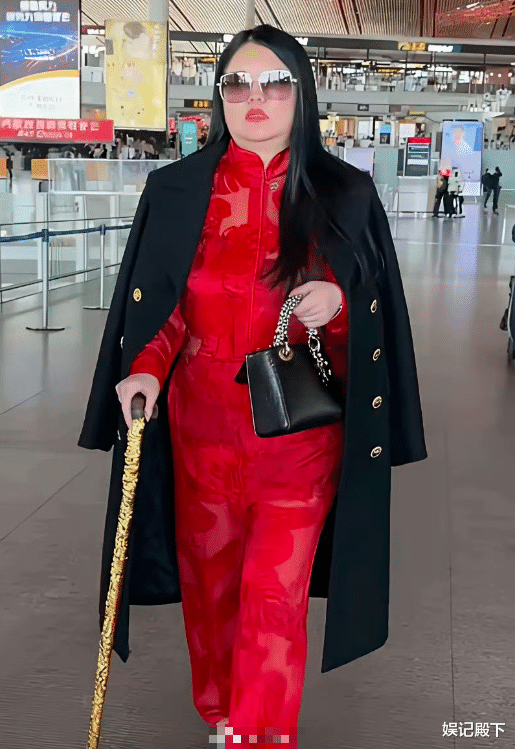 由于身体太胖,从机场走出来的她需要借助拐杖的支撑力才能走得动这一小段路。