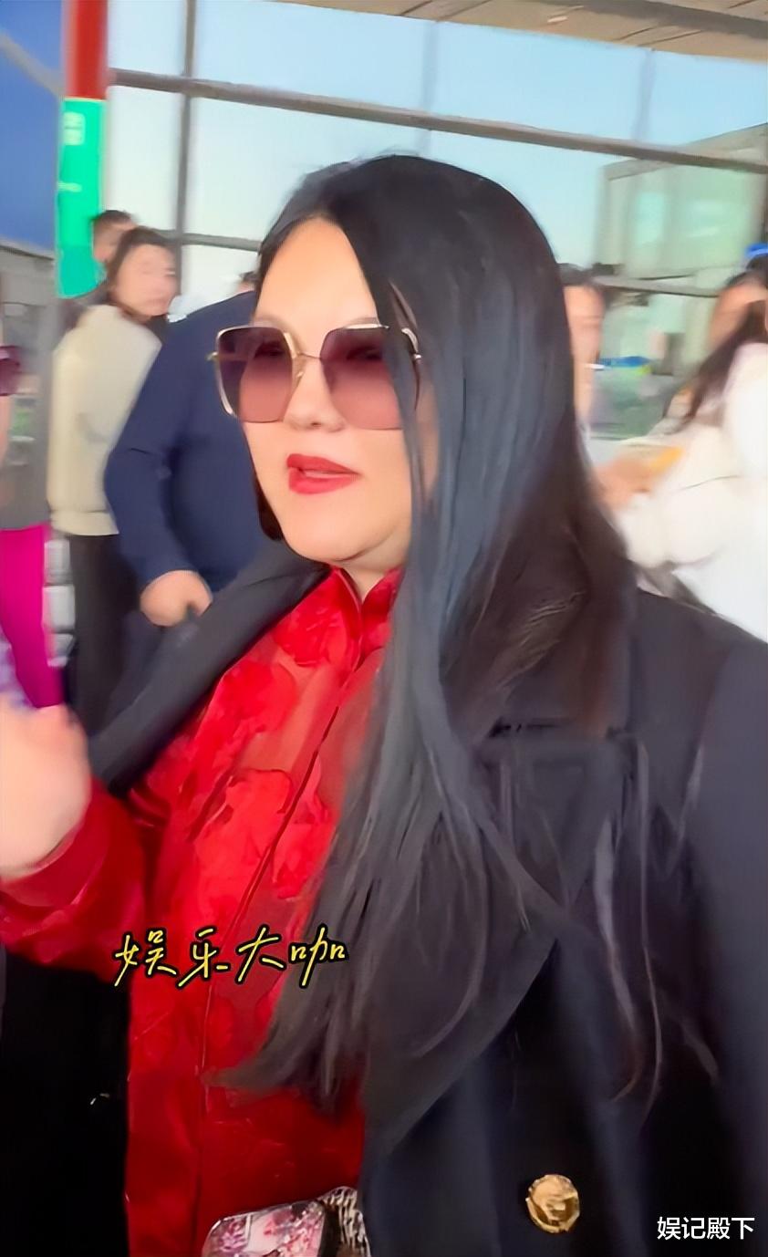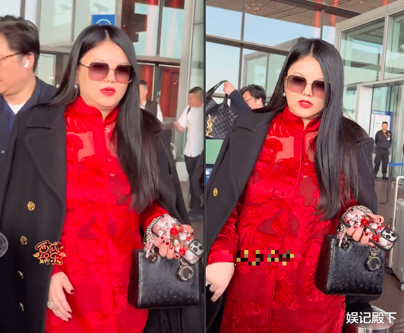 其实在这套中式套装外面还有一件黑色的大衣,但是李湘却并不穿在身上,反而把它披在肩膀上,光是从她一直摆弄外套就能看得出来衣服很容易掉下来,但是李湘就是不愿意好好穿,不论是在机场走路还是在外面寒风中等待时都硬是让它在肩膀上搭着,看人很是累赘。