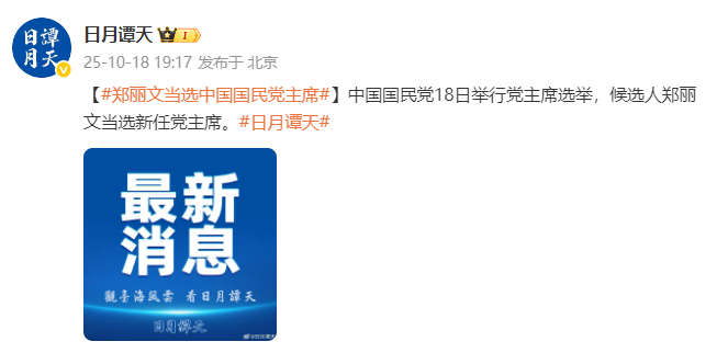 郑丽文当选中国国民党主席 作者: • 更新时间:2025-10-18 20:52 • 中国国民党18日举行党主席选举,候选人郑丽文当选新任党主席。 本文内容由互联网用户自发贡献,该文观点仅代表作者本人。如发现本站有涉嫌抄袭侵权/违法违规的内容,请发送邮件至 203304862@qq.com 本文链接:https://jinnalai.com/jiaodian/783466.html
