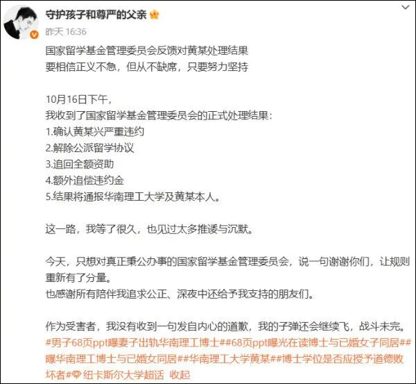 10月16日下午,发布PPT的当事人张先生表示,国家留学基金管理委员会已向他反馈对黄某的处理结果。