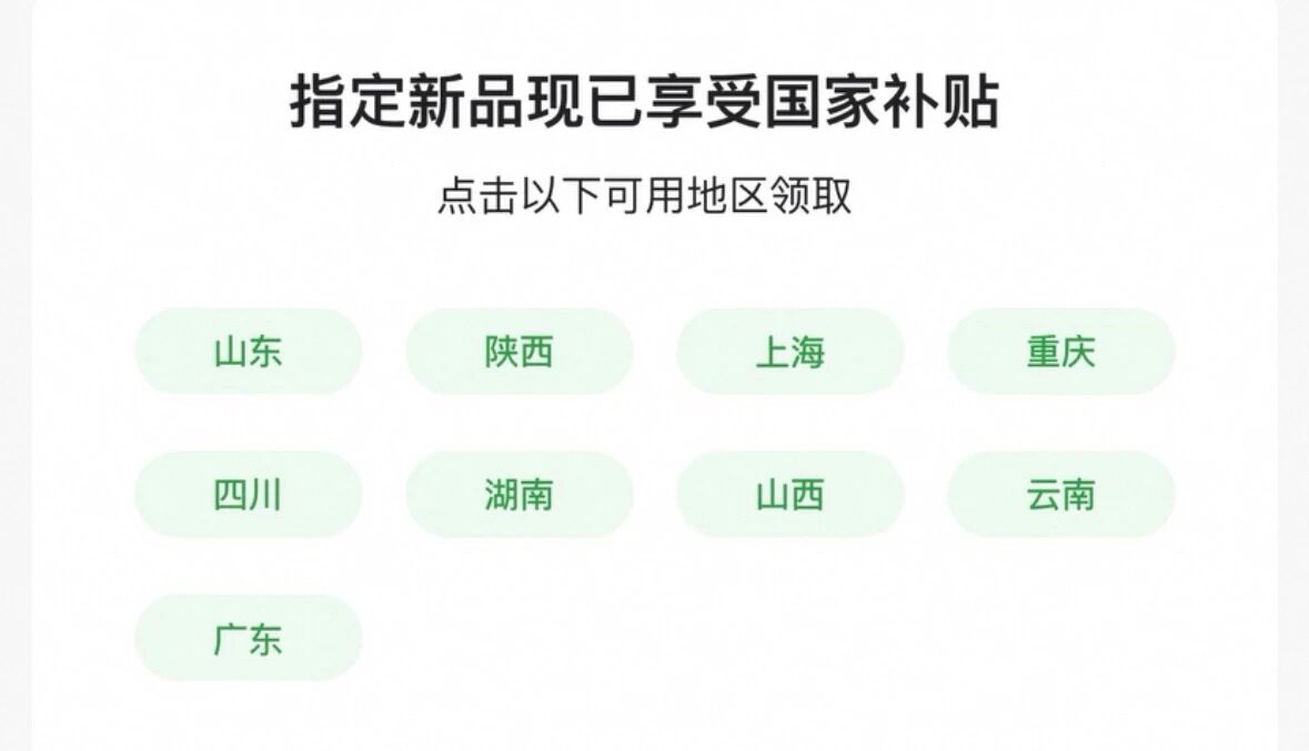 支持国补的地区,苹果也列出来了,包括:山东、陕西、上海、重庆、四川、湖南、山西、云南和广东。