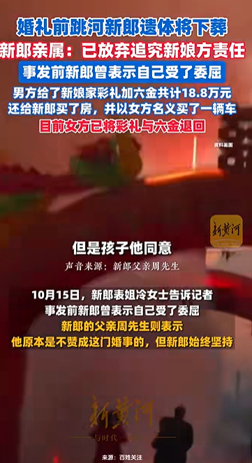10月3日上午,陕西旬阳市男子周某某从婚礼酒店跑至旬河大桥跳河。10月9日,他的遗体在大桥下游百米处被发现。17日,新郎堂伯告诉记者,新郎将下葬,男方放弃追究新娘方责任。
