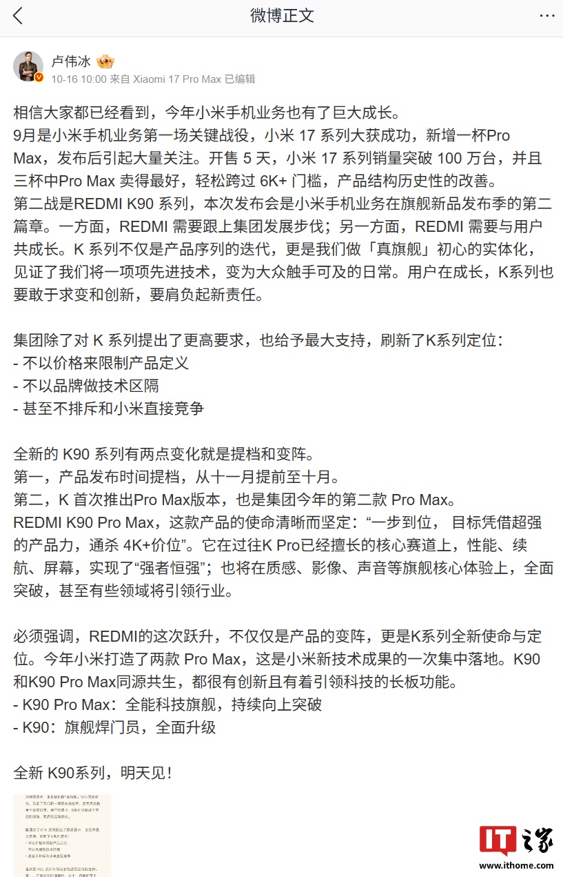 IT之家10月19日消息,10月17日上午,REDMI红米手机官微宣布,REDMIK90ProMax定档10月23日19时正式亮相,新机号称“为追求极致而来”“为挑战巅峰而生”“为不负期待而战”,是REDMI史上第一款ProMax机型。