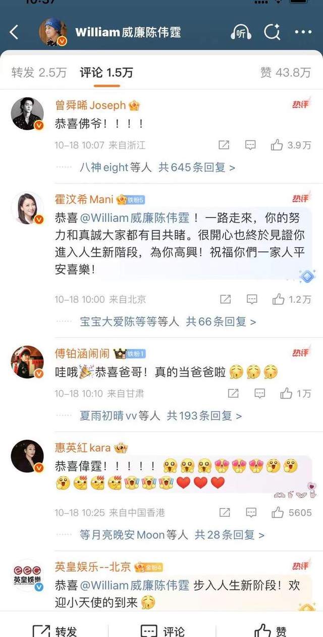 10月18日,陈伟霆与何穗在个人社交媒体账号上同步发布图文,宣布他们已经晋升为父母。