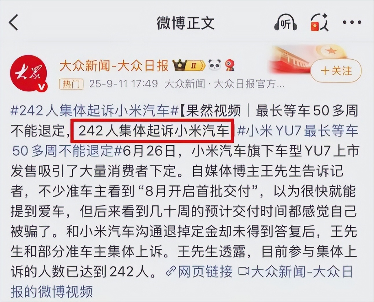 三是用户关系恶化:小米对SU7车主的退钱、改配诉求,以“重新排队30-40周”变相拒绝;面对242名小米YU7准车主因超长等车周期发起的集体诉讼,也未给出令人满意的解决方案,背离了其“与用户交朋友”的初心。