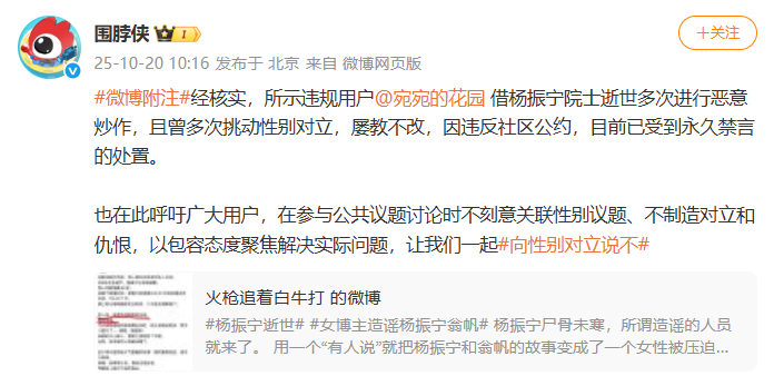 借杨振宁院士逝世多次进行恶意炒作,挑动性别对立,账号被永久禁言 作者: • 更新时间:2025-10-20 19:00 • 钱江晚报10月20日,微博社区观察员官方账号@围脖侠发布消息称:经核实,所示违规用户@宛宛的花园借杨振宁院士逝世多次进行恶意炒作,且曾多次挑动性别对立,屡教不改,因违反社区公约,目前已受到永久禁言的处置。 本文内容由互联网用户自发贡献,该文观点仅代表作者本人。如发现本站有涉嫌抄袭侵权/违法违规的内容,请发送邮件至 203304862@qq.com 本文链接:https://jinnalai.com/jiaodian/783920.html