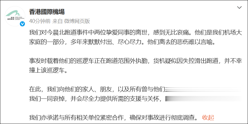 香港机管局就有机场员工于本次意外中离世深表哀痛,并将尽一切能力支援死者家属。