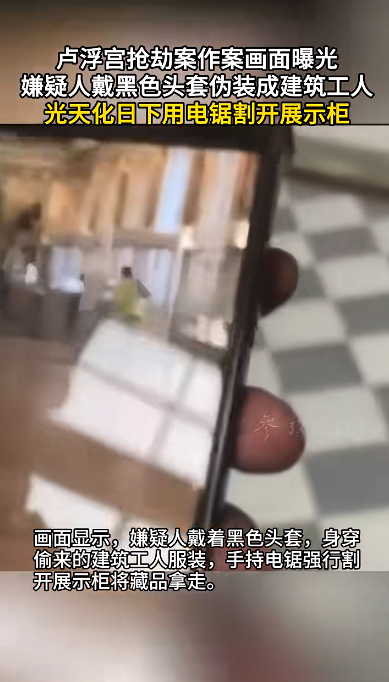 据海客新闻,当地时间19日晚,英国《太阳报》曝光了当天发生于法国巴黎卢浮宫的抢劫事件嫌疑人的最新作案画面。画面显示,嫌疑人戴着黑色头套,身穿偷来的建筑工人服装,手持电锯强行割开展示柜将藏品拿走。