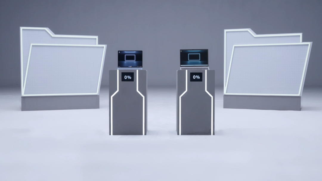 为了让速度差异更加明显,本轮我们同样加入了装置验证:“文件夹”装置,通过灯光变化实时呈现两台电脑端的解压缩进度。