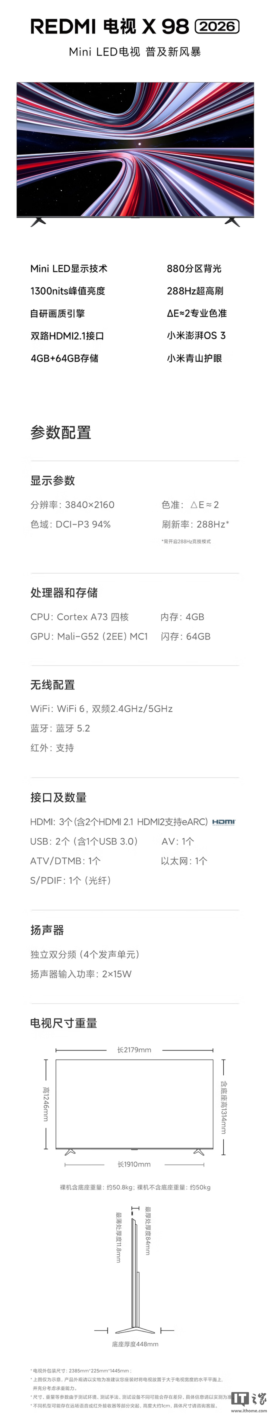 小米REDMI电视X2026现已在京东开售,IT之家附参数表如下: