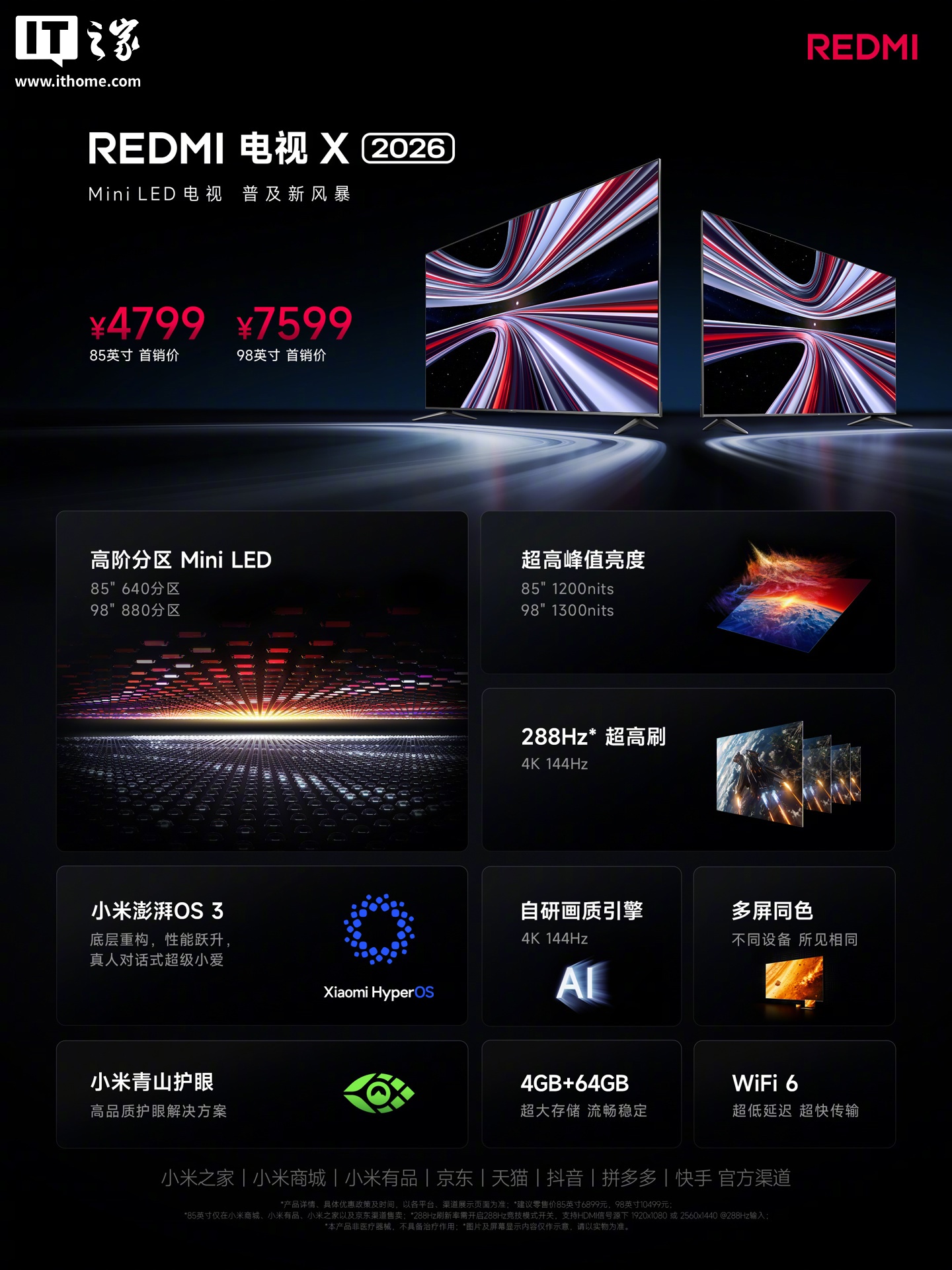 IT之家10月23日消息,小米今日发布了98英寸REDMI电视X2026,售价7599元。该电视此前有一个85英寸版,售价4799元。
