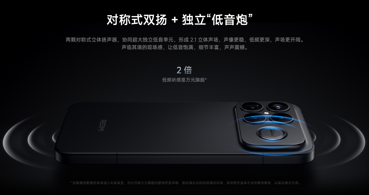 最后在外放方面,K90 Pro Max 搭载双 1115F 对称式扬声器,背面还有一个 1620 超大尺寸的低音单元,还有 BOSE 调音加持。