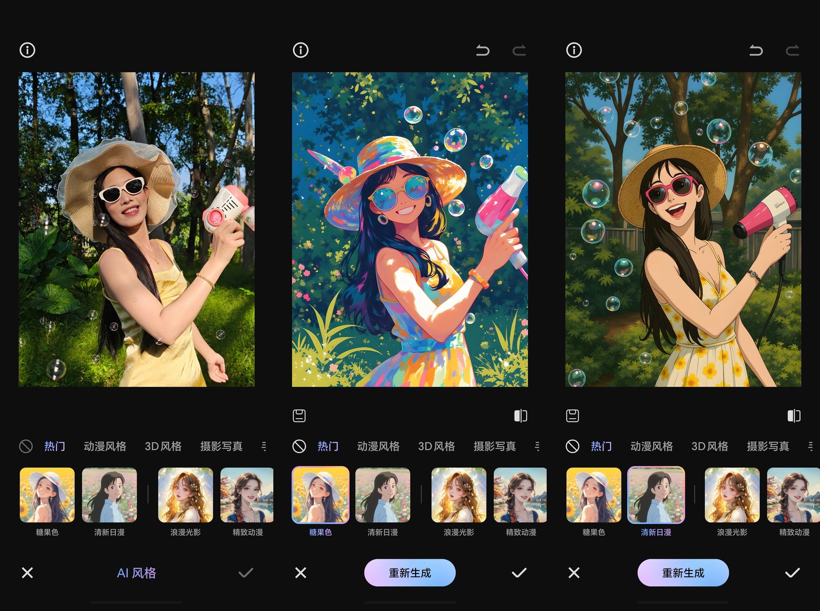 还有AI风格功能,可以智能生成各种个性化风格,这个功能在人像拍摄上就能玩出超多花样,有动漫风格、3D风格、摄影写真等多种风格可选,总有一款符合你的审美。