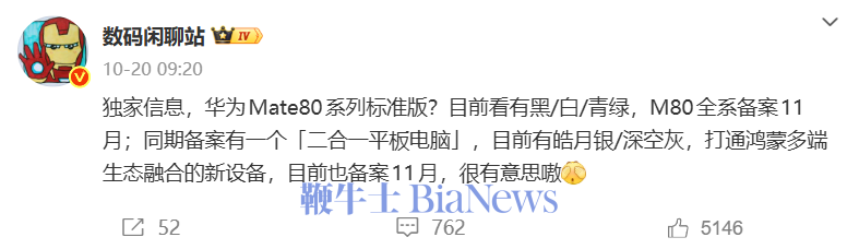 此前,该博主透露,华为Mate80系列标准版的新机备案完毕,目前看有黑/白/青绿三种颜色,M80全系备案11月。