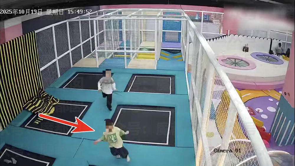 澎湃新闻获取的现场监控视频显示,当天15时49分,两名孩童在游乐场蹦床上玩耍,其中穿绿色衣服的小孩在蹦床上跳了数下后,于15时51分忽然坐了下来,而后又起身走到后方的网格墙区域,再次坐下。和他一起玩耍的白衣小孩随后急匆匆跑向前方,出了监控画面。