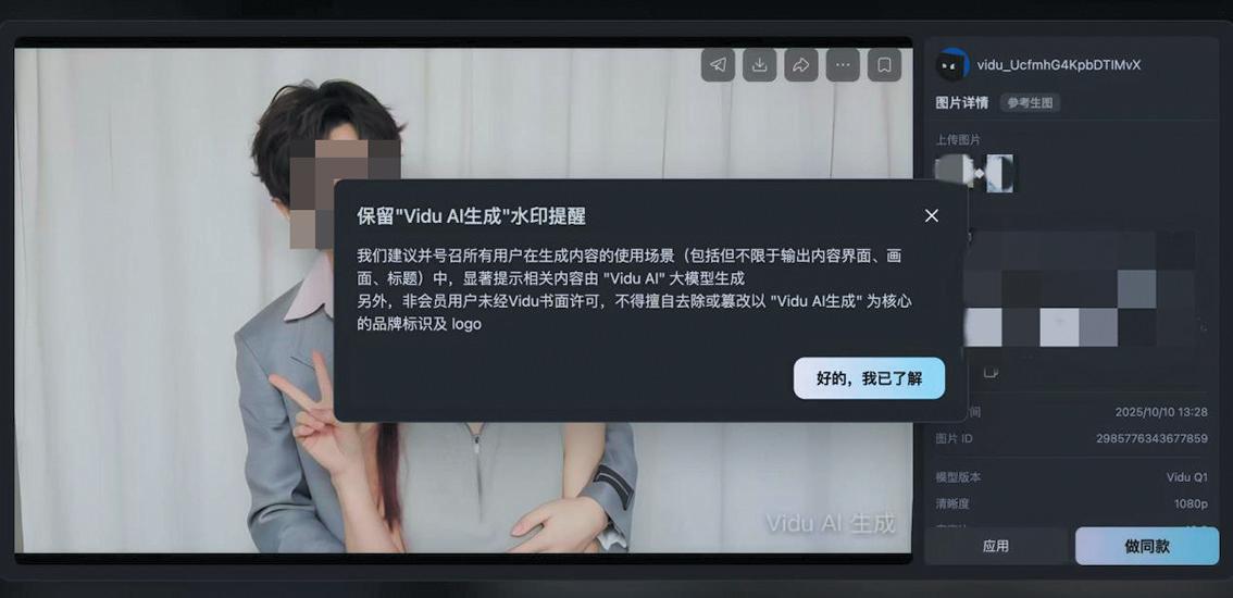 记者下载不带水印版本图片时,Vidu弹出的提醒。Vidu官网截图