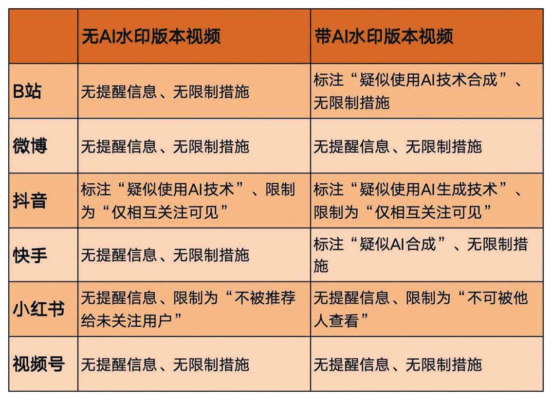 此次测试中,快手、B站对自带AI水印版本的视频标注了“疑似AI合成”,暂时未对无AI水印版进行明显提示。对于记者上传的两个版本的短视频内容,微博、视频号均未采取限制措施,也未进行AI相关提醒。
