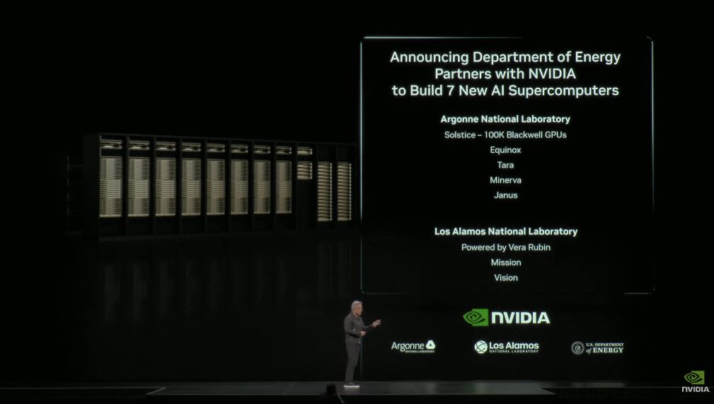 黄仁勋还宣布与美国能源部达成协议,将再建设7台超级计算机。这些超算将使用Blackwell和下一代VeraRubin架构芯片,分别配置在阿贡国家实验室和洛斯阿拉莫斯国家实验室。