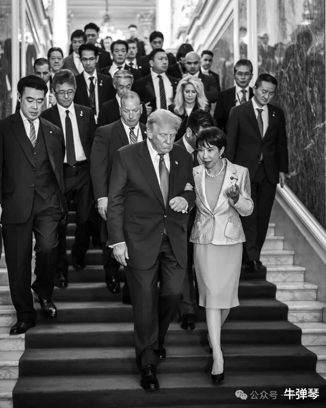 第二幕,白宫贴出一张图片,下台阶的时候,高市早苗直接挽着特朗普的胳膊。