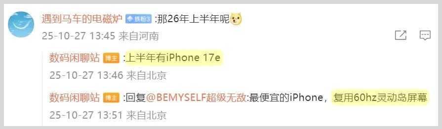 该博主还表示,iPhone 17e终于取消刘海屏,将改用“灵动岛”设计,但仍无缘高刷,继续采用60Hz低刷屏。大概率为iPhone 15/16同款显示屏。