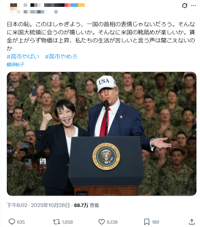 例如在社交平台“X”上就出现了“高市别干了”(高市やめろ)的话题词。有网友愤怒地表示:“真是日本的耻辱。这种兴奋劲儿,可不像是一个国家首相该有的。你跟美国总统见面就这么开心吗?舔美国的鞋子就这么快乐吗?工资停滞不前,物价飞涨,我们的生活越来越艰难,这些声音你听不到吗?”该评论获得了超过1600转发和6000点赞。