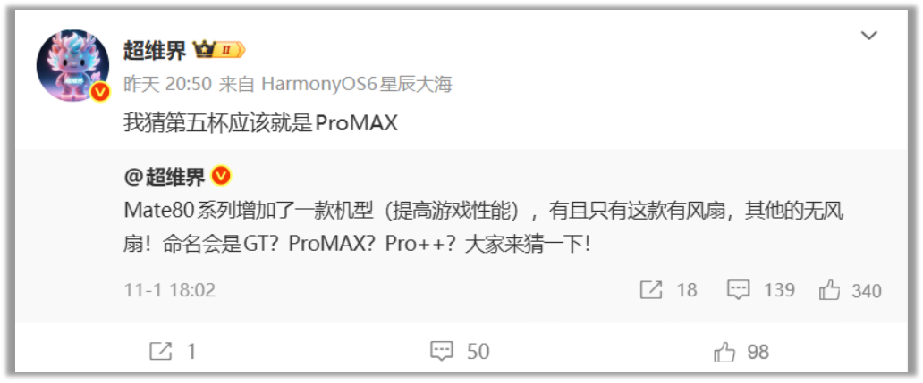 数码博主超维界表示,华为Mate 80的第五款机型可能命名为Pro Max版本,它将是唯一配备最新散热解决方案的机型,提高游戏性能。
