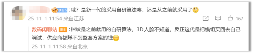 在评论区,爆料者补充说明,华为早已在指纹传感器中采用自研算法,而此次的重点是3D人脸识别方案。华为采购主要硬件后,会自行进行深度改造。另一位爆料者称,随着技术升级,未来的Nova系列也有望搭载3D人脸识别功能。华为可能从今年的Nova 15 Ultra开始推进这一计划。