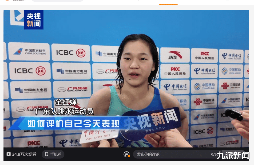 广东队的全红婵/王伟莹无缘奖牌,名列第五。赛后,全红婵接受媒体采访。记者提问:“全妹,不少观众都是过来看你的,你是什么感觉?”全红婵表示:“很开心。有的观众是从很远的地方过来的,也有不少广东人,谢谢他们这么关注跳水,请继续多多关注跳水,谢谢!”记者询问全红婵伤情恢复情况,全红婵笑着叹气,说:“不怎么样。”