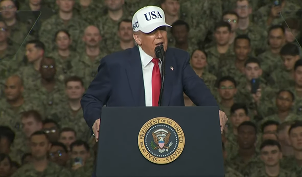 当地时间10月28日,特朗普在演讲中批评电磁弹射系统。美媒视频截图