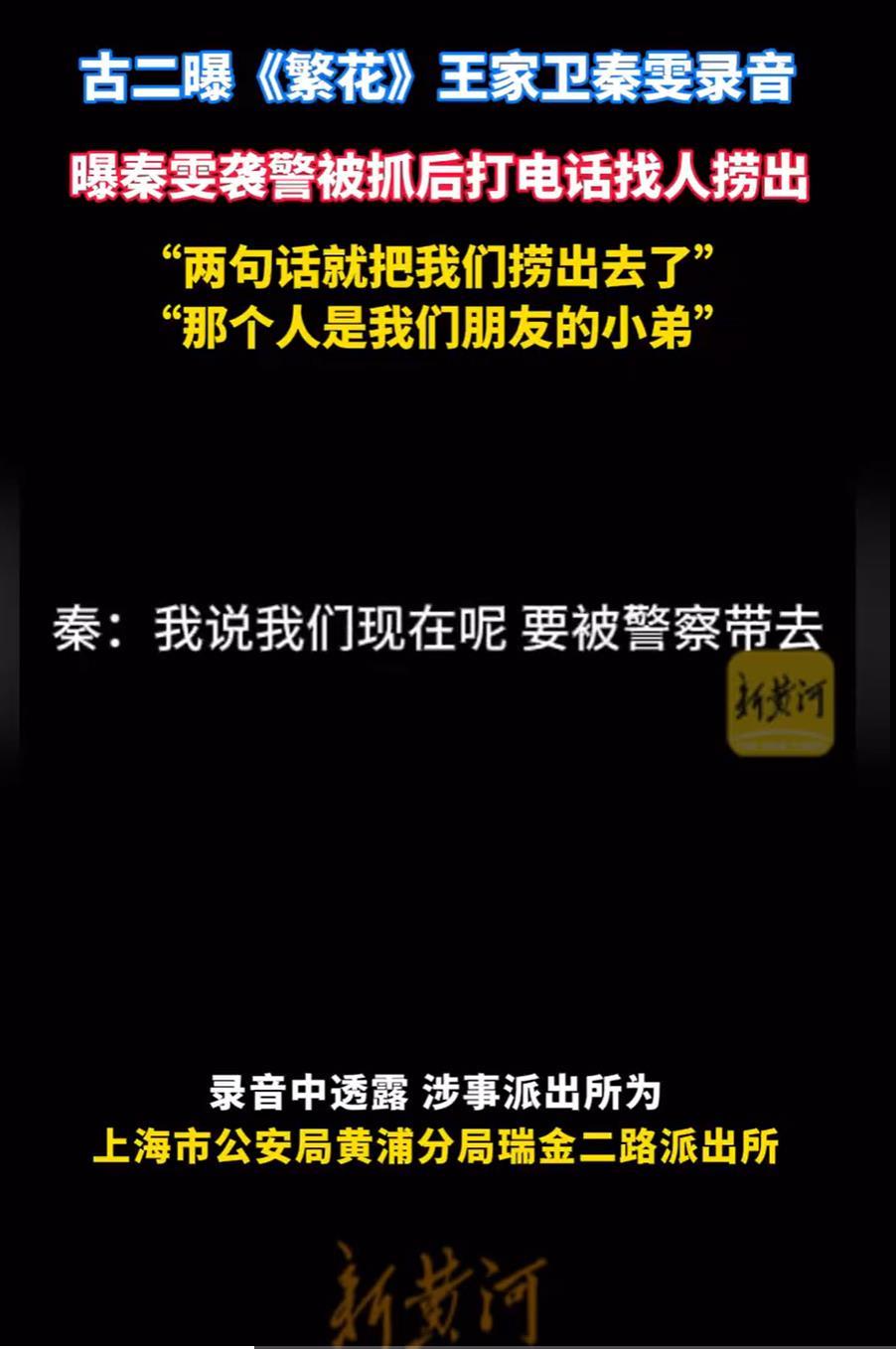 10月31日,古二再曝《繁花》剧组王家卫与秦雯等人的对话录音。音频中,秦雯与女同伴自曝袭警后被抓进派出所,打电话找人捞出,王家卫问:“你们这么张扬,还要打电话给所有警察朋友?”女同伴称她打了一个电话,来者很有套路:“两句话就把我们两个人捞出去了。他实际上已经给派出所所长打过电话了。”秦雯称,把她们捞出来的是朋友的小弟。录音中曝光,涉事派出所为上海市公安局黄浦分局瑞金二路派出所。(据10月31日新黄河客户端)