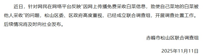 近日,针对网民在网络平台反映“因网上传播免费采收白菜信息,致使自己菜地的白菜被他人采收”的问题,松山区委、区政府高度重视,已经成立联合调查组,开展调查处置工作。后续情况将及时向社会发布。