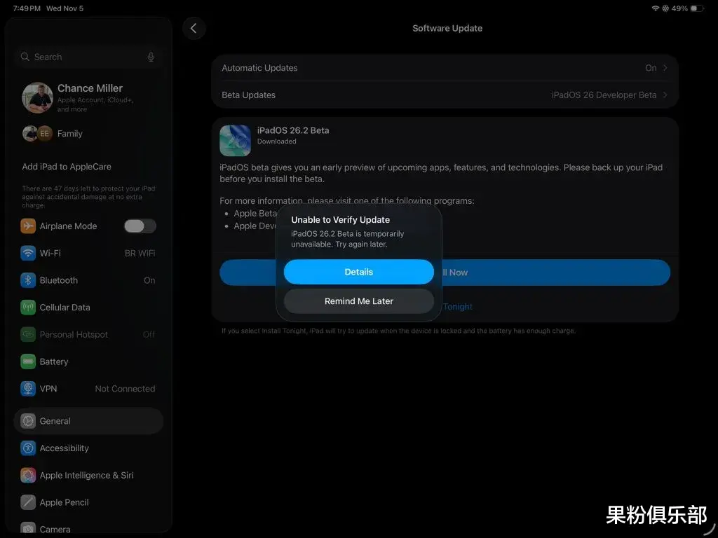不难看出,M5 iPad Pro 在尝试升级 iPadOS 26.2 Beta 版系统时,也弹出了无法验证的提示。