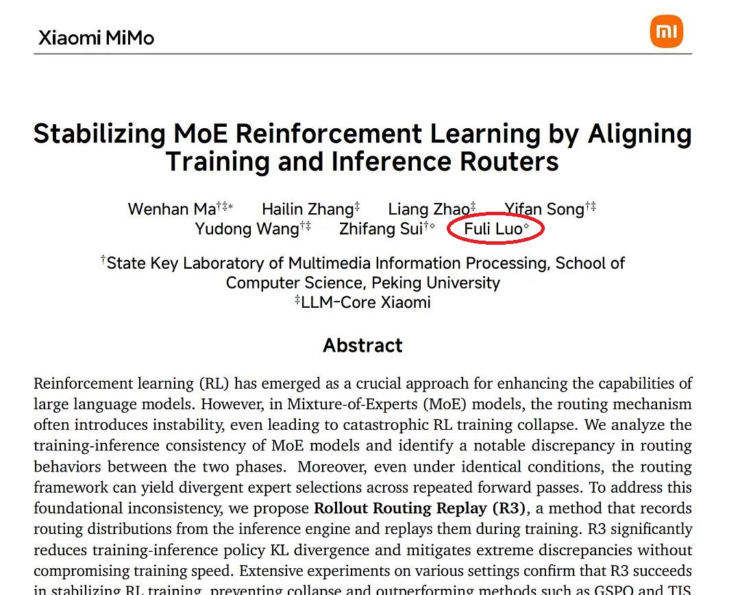 10月14日,小米与北京大学联合署名的论文发表于arXiv,罗福莉位列通讯作者。尽管论文没有标明她是否属于小米大模型团队,但是作为论文的主要负责人,小米和罗福莉显然已经进行了深度的合作。