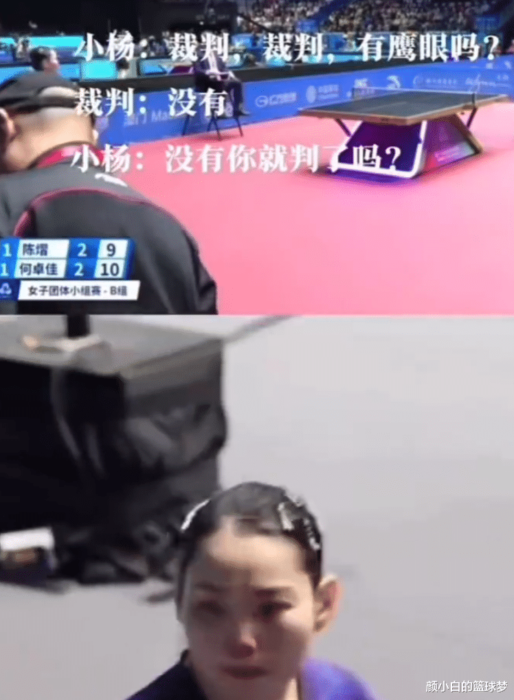 赛后何卓佳、杨广弟找到裁判、当值技术台的工作人员申诉,看得出来何卓佳对裁判的吹罚极度不满。