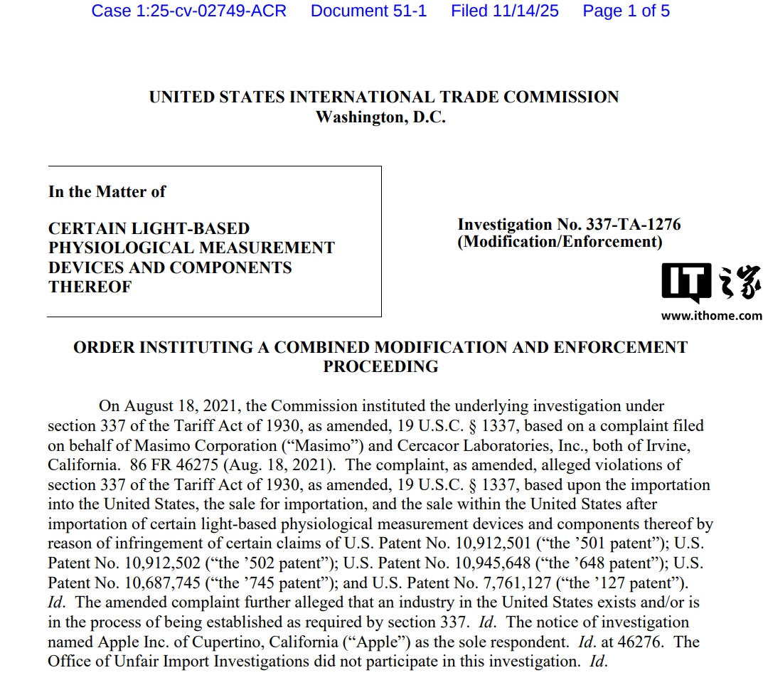 IT之家11月15日消息,科技媒体9to5Mac昨日(11月14日)发布博文,报道称因与健康科技公司Masimo的专利纠纷,苹果AppleWatch的血氧功能再次面临美国国际贸易委员会(ITC)的审查。