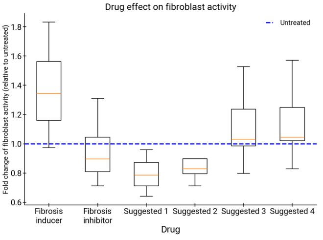 AI推荐的药物(Suggested1、2)在实验中显著降低了成纤维细胞活性,表现出抗纤维化效果;而科学家自行挑选的药物并未显示出同等效果。