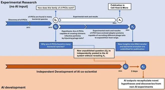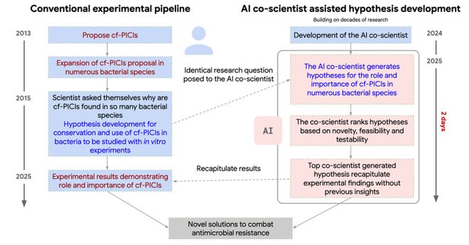 传统科研流程vsAI联合科学家:帝国理工团队花费近10年才逐步验证的细菌DNA传播机制,AI在两天内就生成并排序出相同假设,并提出额外可验证的新思路。