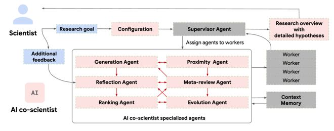 谷歌「AI联合科学家」的工作流程:科学家输入研究目标,监督者将任务分配给不同的智能体,经过生成、反思、演化、检查等多轮迭代后,形成研究假设与方案,并可结合科学家的反馈不断优化。
