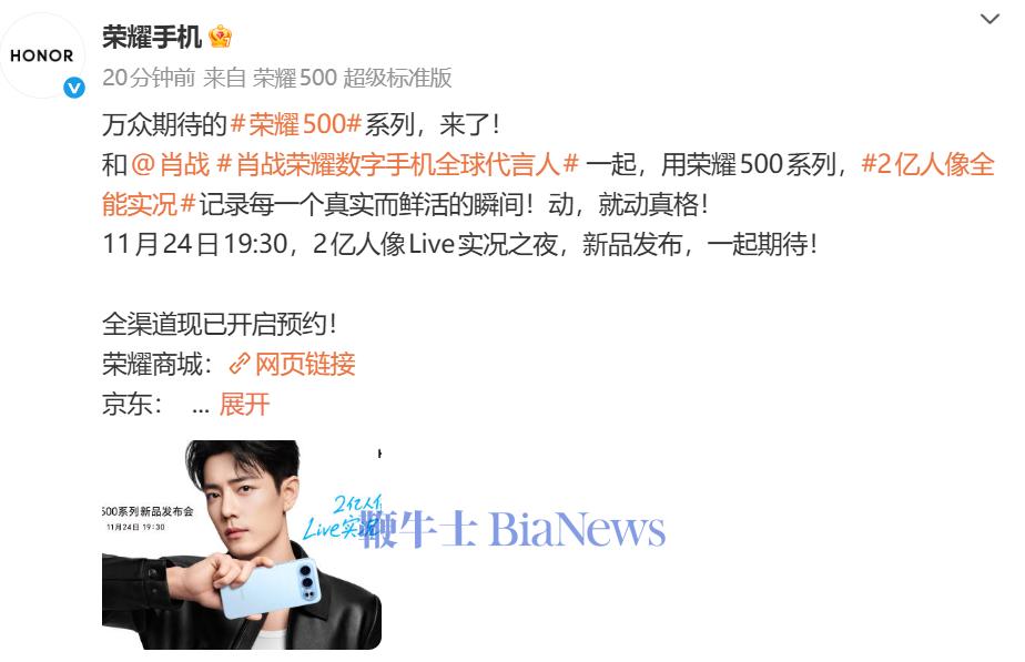 11月12日,荣耀500系列正式宣布,全系越级配置,将带来两款机型:超级标准版、超级Pro版。