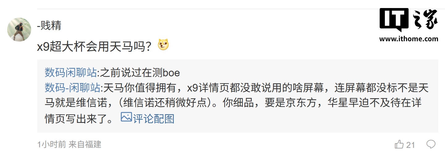 后续有用户在评论区询问:“x9超大杯会用天马吗?”,博主回复道:“之前说过在测boe”;另一名用户则回复道:“屏下要加快速度”,博主则回复道:“之前说过屏下摄像头节点是2027,同步苹果”。