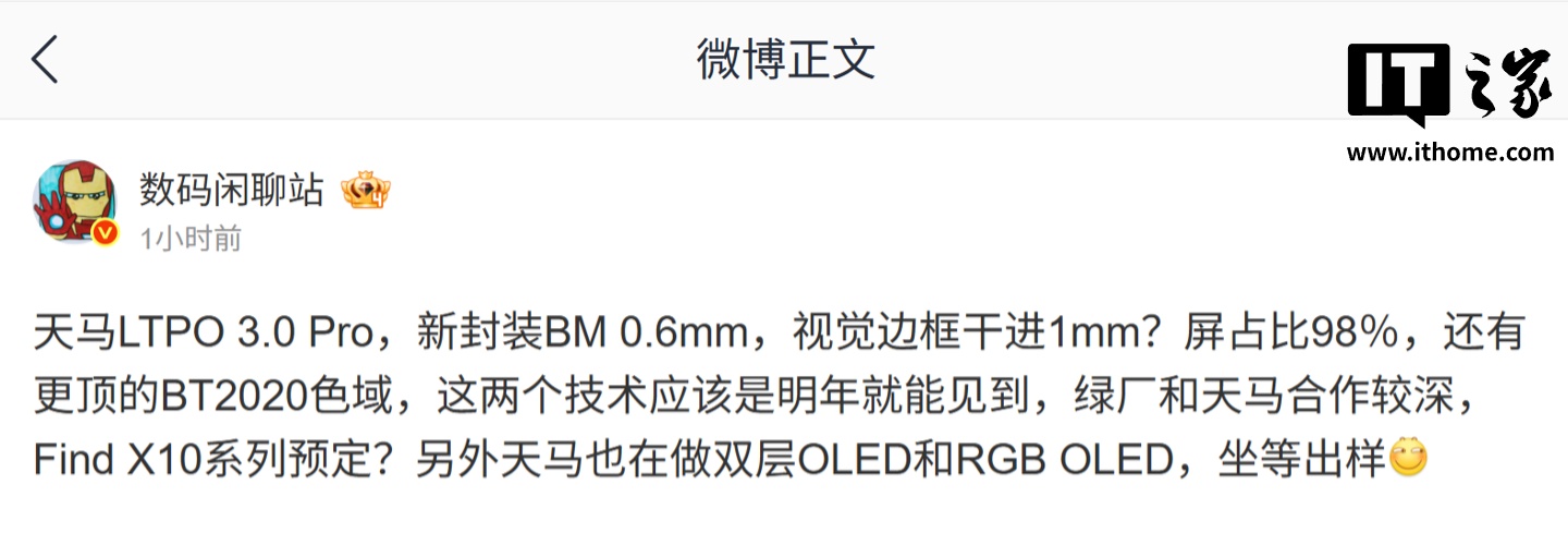 IT之家11月19日消息,博主@数码闲聊站今天在微博透露,天马LTPO3.0Pro技术将拥有BM0.6mm新封装,视觉边框有望“干进1mm”。