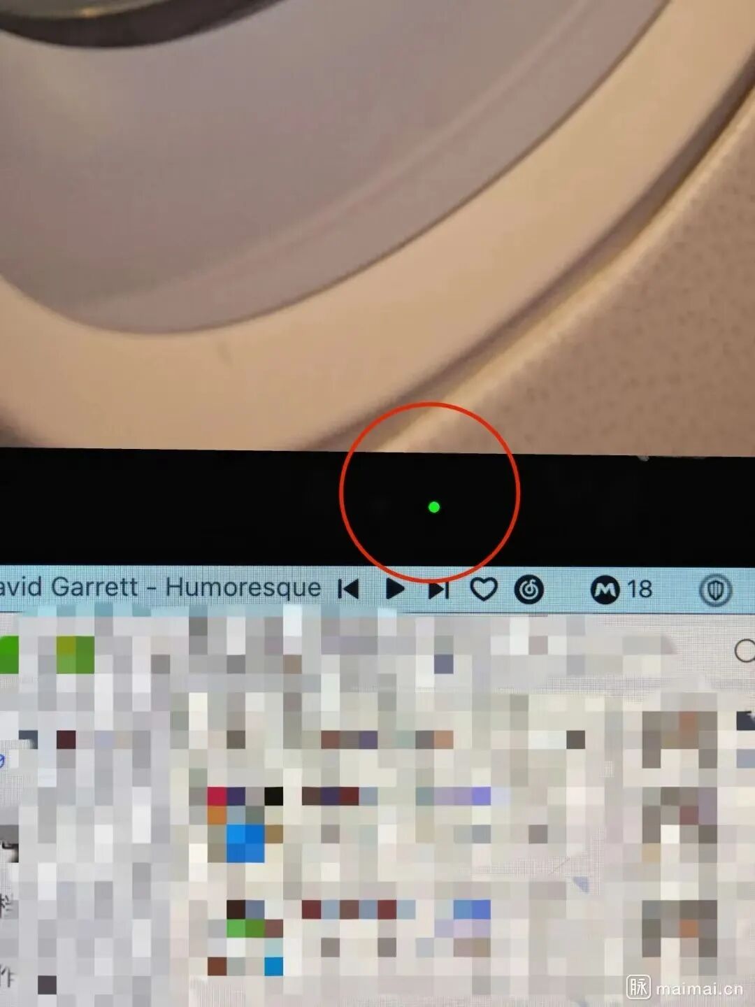 根据该员工晒出的照片显示,其笔记本电脑屏幕上摄像头处绿灯呈现常亮状态。(注:背景“飞机窗口”为马赛克效果,并非真在飞机上)。