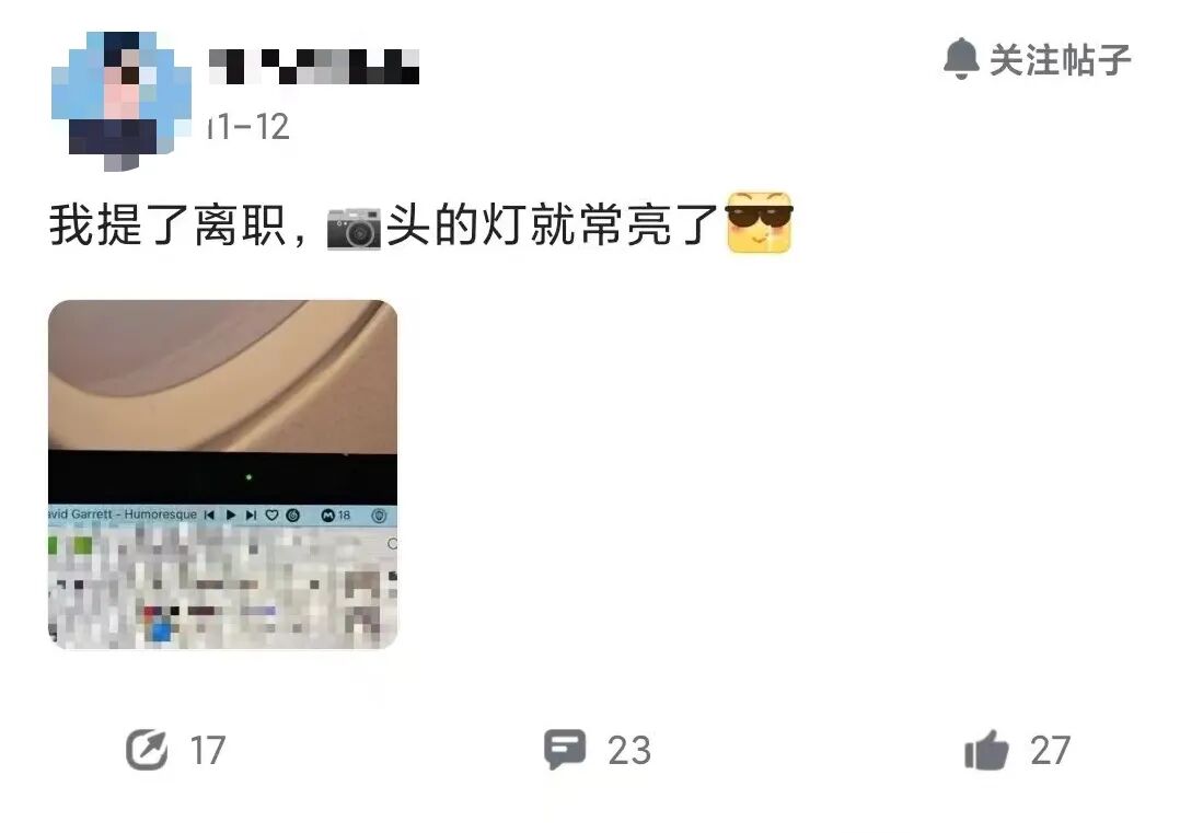 还有网友认为,公司在员工离职后通过技术手段监控员工的可能性并不大。笔记本摄像头“常亮”存在诸多可能性。