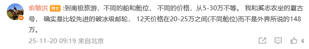 随后,他还在评论中回复:到南极旅游,不同的船和舱位,不同的价格,从5-30万不等。我和奚志农坐的夏古号,确实是比较先进的破冰级邮轮,12天价格在20-25万之间(不同舱位)而不是外界所说的148万。