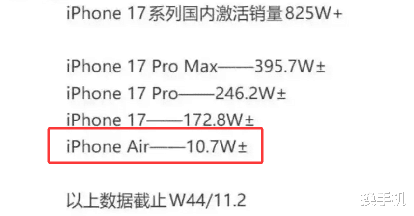 随后一份来自数码博主的数据称,iPhone Air上市半个月,激活量仅10.7万台。