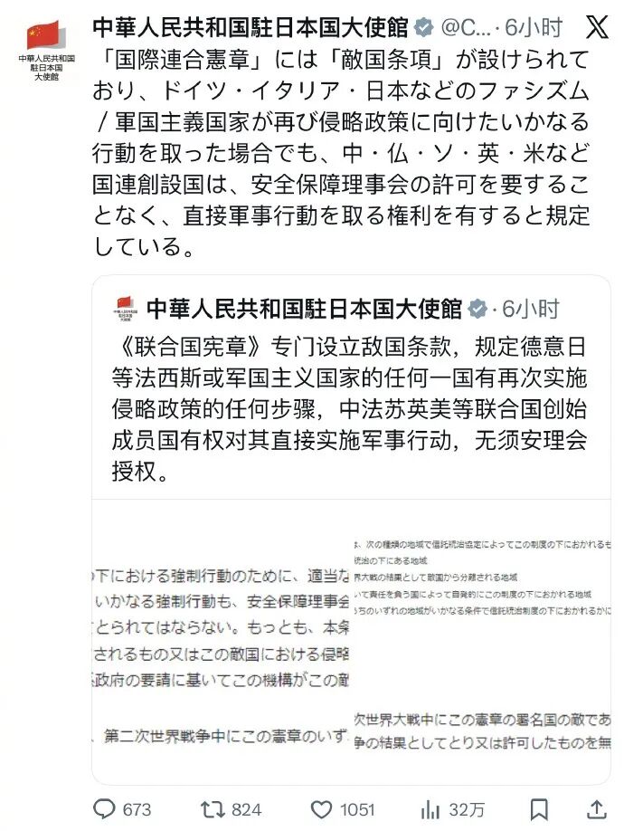 据环球时报,11月21日,中国驻日大使馆在社交平台X用中日双语发帖:《联合国宪章》专门设立敌国条款,规定德意日等法西斯或军国主义国家的任何一国有再次实施侵略政策的任何步骤,中法苏英美等联合国创始成员国有权对其直接实施军事行动,无须安理会授权。