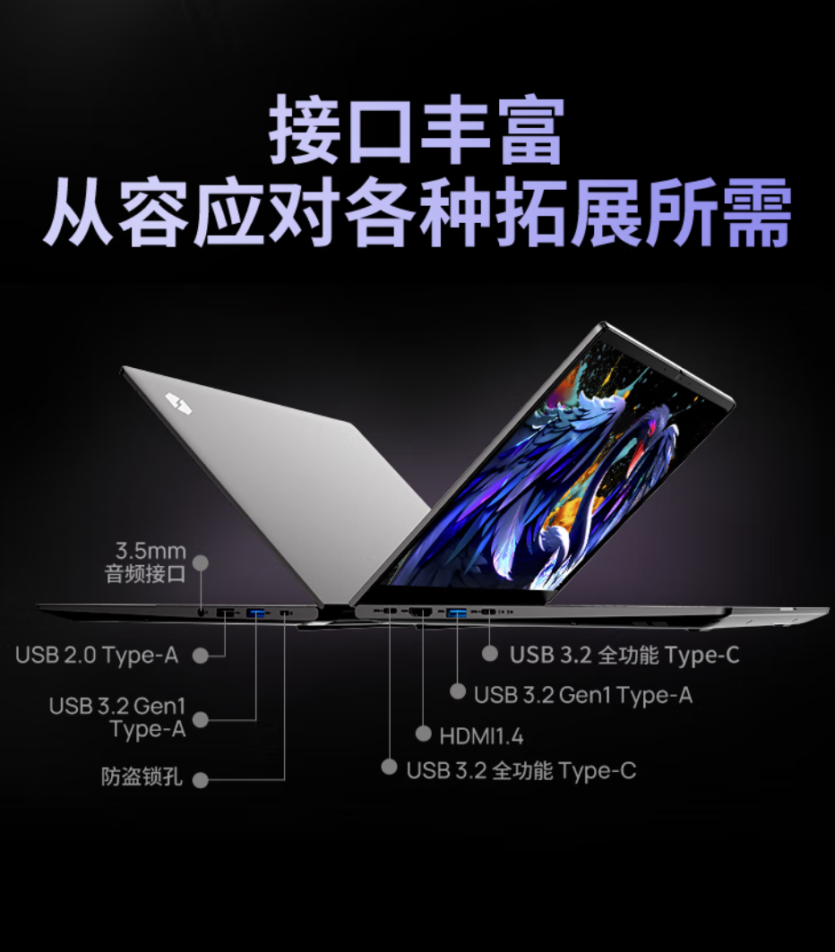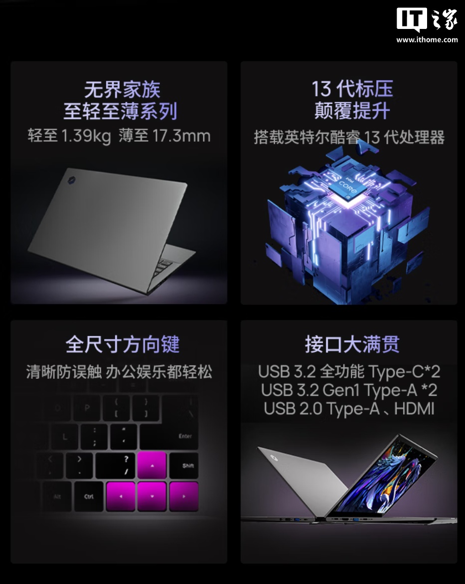 据介绍,这款笔记本搭载英特尔13代标压处理器,采用大小核异构设计,可满足办公、娱乐、学习场景性能,配备CNC工艺Unibody机身,C、D两面衔接过渡更加自然,机身最薄处17.3mm,重量1.39kg。