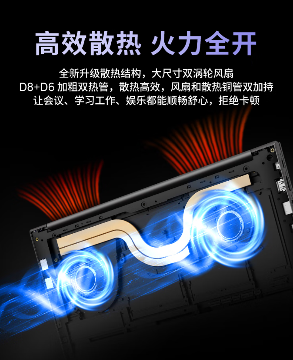 此外,这款笔记本还拥有全新升级散热架构,内置大尺寸双涡轮风扇,带有D8+D6两条加粗热管,号称可实现“高效散热”,配备节能模式、平衡模式、性能模式三种散热场景,只需按下Fn+X键就能切换,配备65W电源适配器,摄像头拥有物理开关,可保护隐私。
